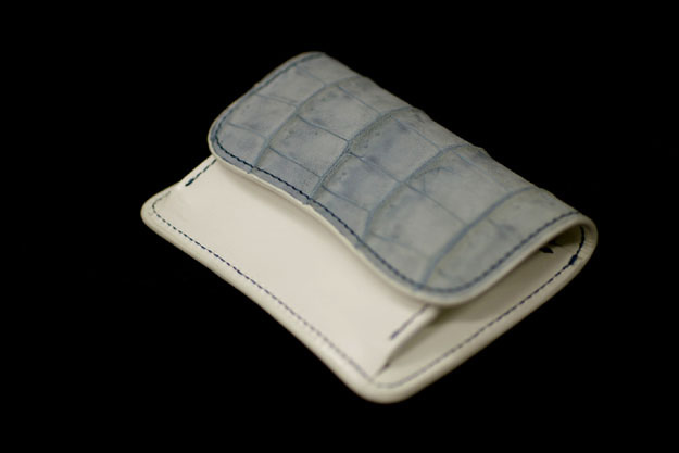 ブッテーロのホワイトは表面に化粧をしていますので、色が褐色に変わっていく経年変化をする訳ではありませんが、クロコダイルの部分は色が深くなっていき、ツヤが上がってきます。