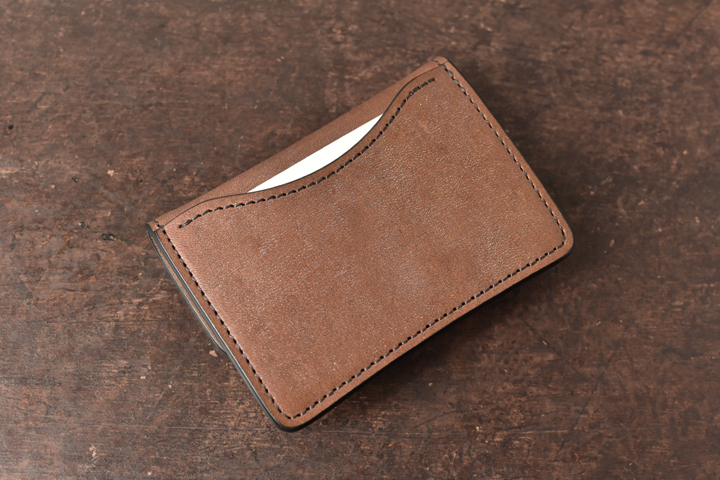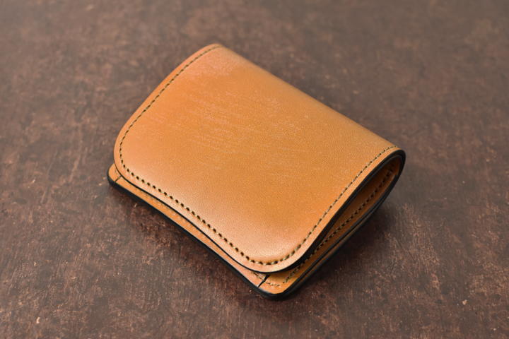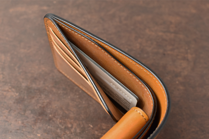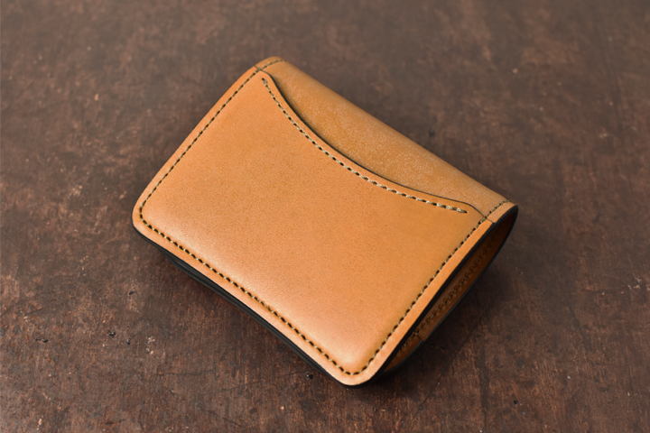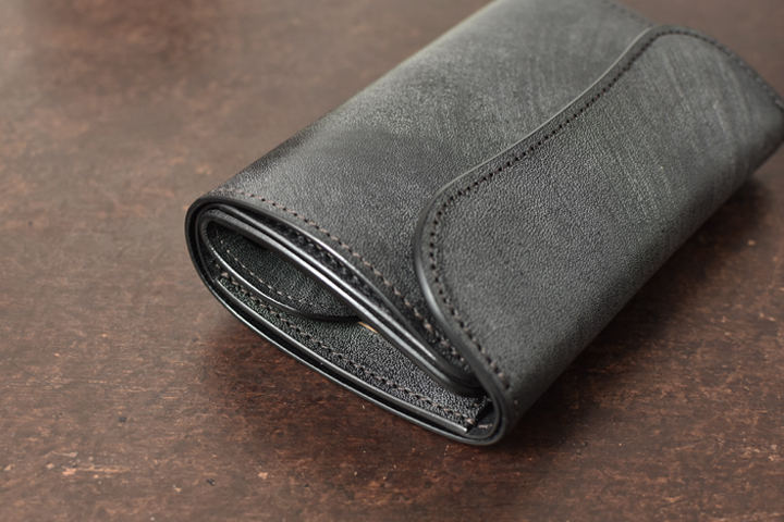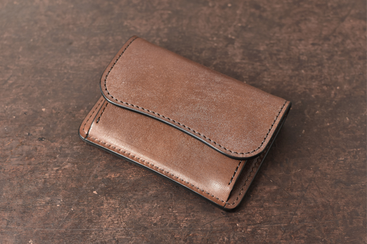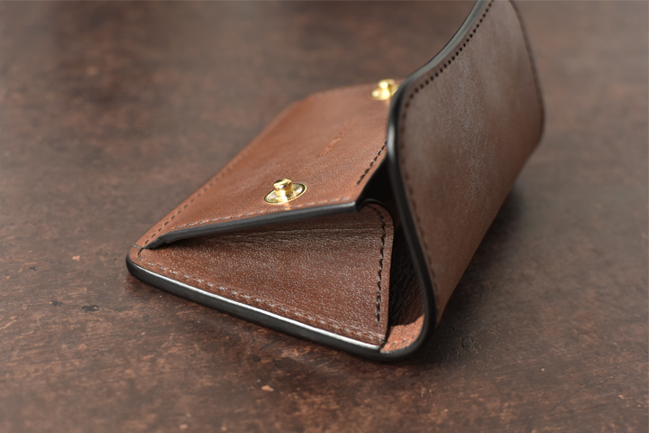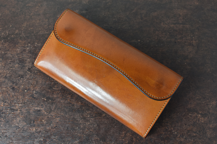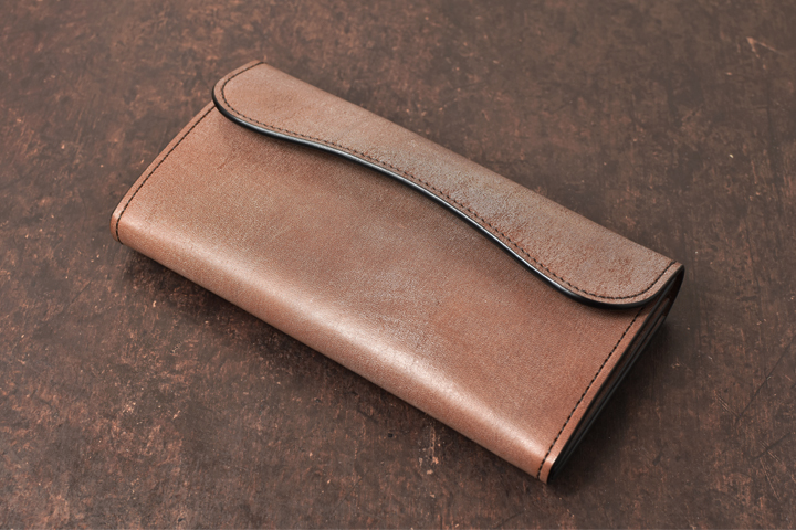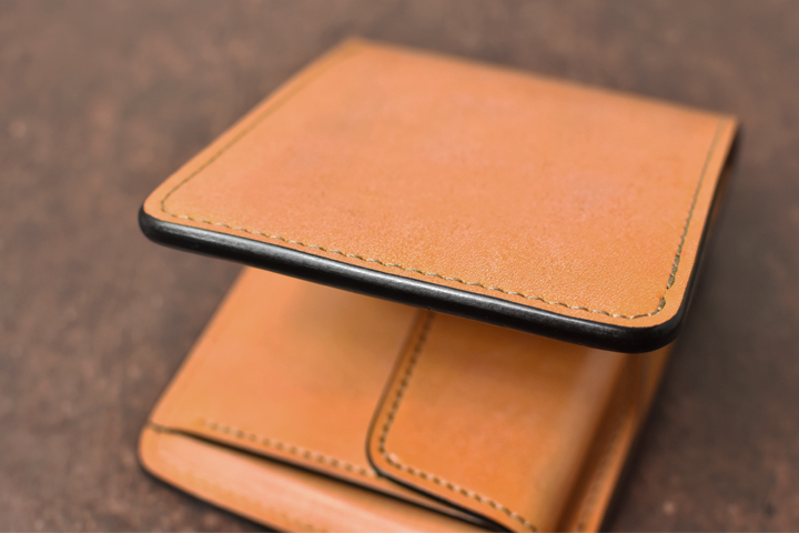 シンプルな外観がコバ(製品の縁、革の裁断面)の存在感を際立たせ、時間をかけて磨かれたコバの美しさが見て取れます。