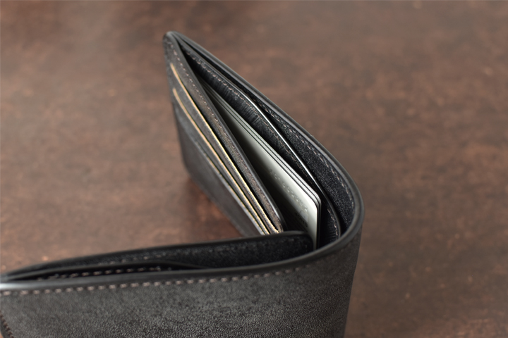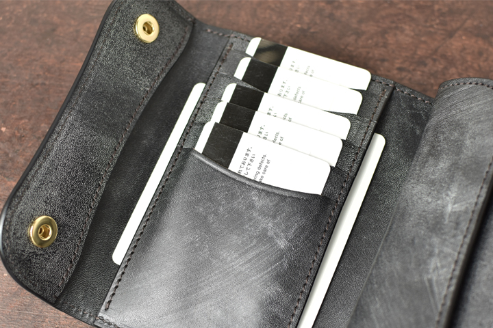 ぎっしりとした革の塊を感じる、収納力に優れた中型三つ折り財布です。