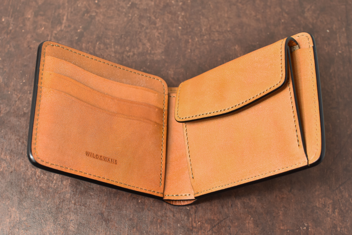 内装の中央に位置する小銭入れはWILDSWANSのロゴ入り入りのエクセラファスナーで閉じられており、エクセラファスナーを開くと片側のマチが大きく開くため、小銭を取り出す際に奥まで指が届くように設計されています。
