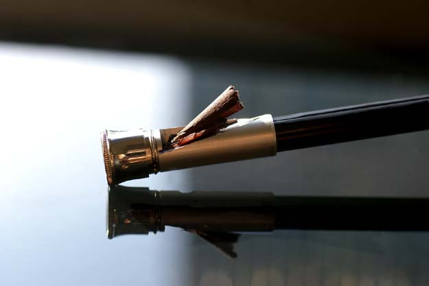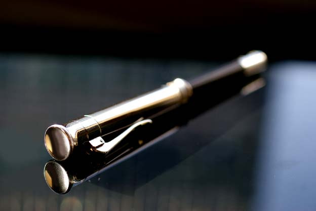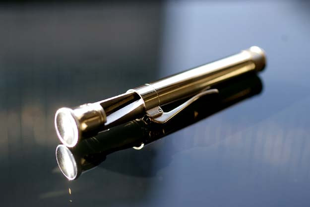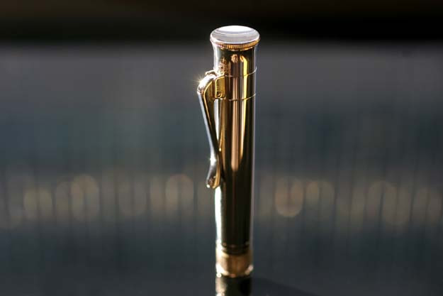 ペン先を保護するキャップは重厚な作りですのでズッシリとした重さがあります。キャップエンドに近づくにつれて裾が広がる意匠は、同じ伯爵コレクションの万年筆やボールペン等と共通の意匠であり、ファーバー・カステルを代表するアイコンの1つでもあります。