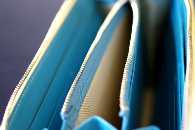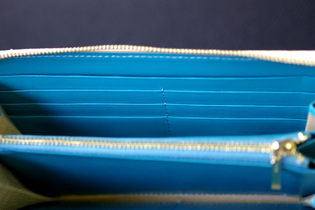こちらはライトブルーです。コイン室はファスナー開閉式の片マチ構造で、容量はたっぷりあります。このコイン室を境に、両側にある大きな部屋の上部に札入れ室が付いています。