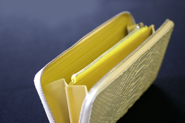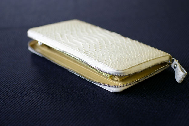 開くと中央にファスナー式のコイン室があり、コイン室を境に2部屋あります。それぞれが大きな部屋になっていて、パスポートも楽々入る大きさですのでポスポートケースとしてもご利用いただけます。(内側の色はライトイエローとライトブルーの2色ありますが、外側は同じ生成りのパイソンです。)