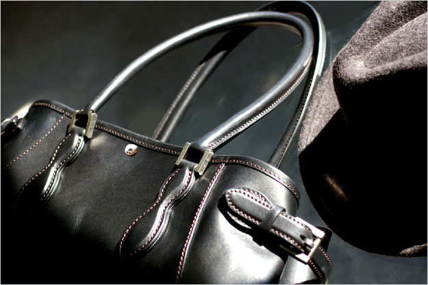 また前回も書きましたが、ディテールの各パーツは厚みを持たせた、より重厚な作りになっているのがこの鞄の特徴の1つでもあります。(例えばハンドルの付け根にある流線形の革のパーツなどは、革を4枚貼り合わせて本体に縫製されています。)