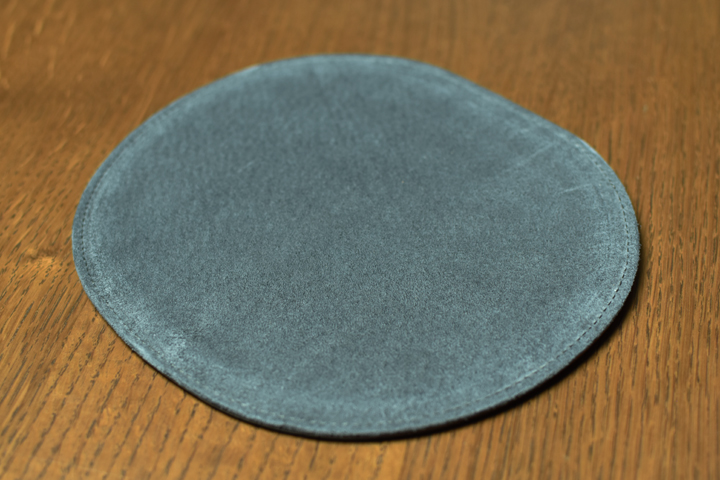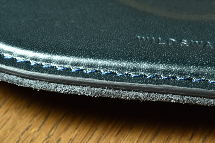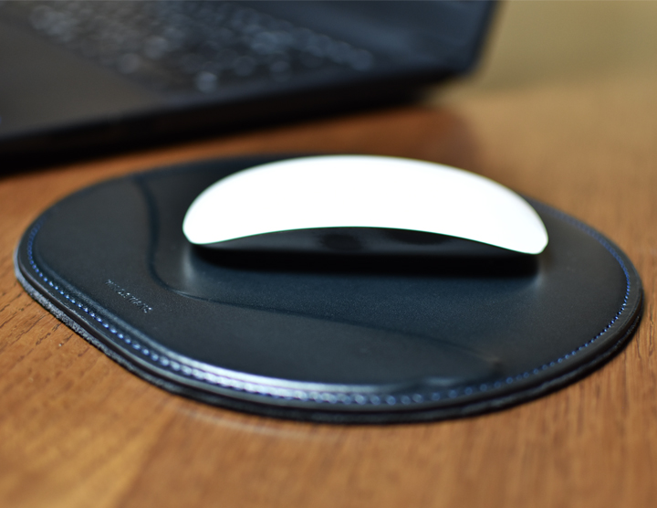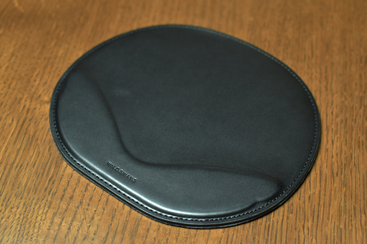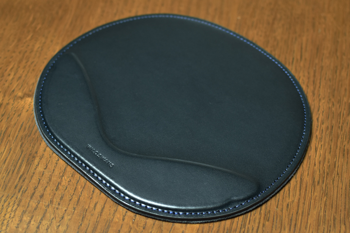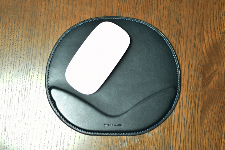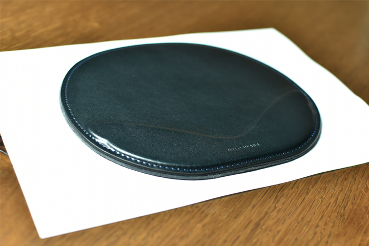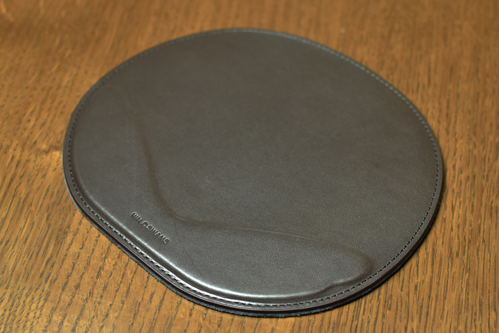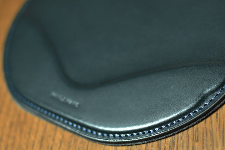 本体は芯材を表面・背面の皮革で挟んで縫製されており、板のようにがっしりとした平面でマウスの滑りもスムーズです。