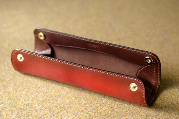開けるとこんな感じです。以前は内側の素材にヴェロアを使っていましたが、最近は毛足の短いスウェードになりました。同じ様に起毛させた革ですので、手触りがとても良いです。