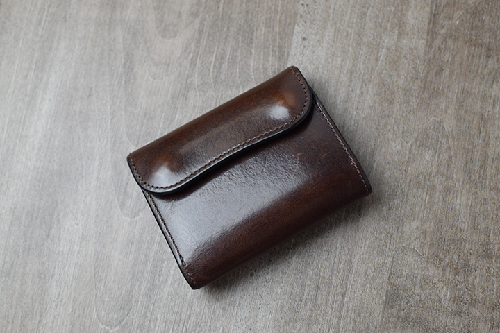 続いて何度かこちらのブログでもご紹介している小型三つ折り財布・サドルプルアップENO(イーノ)/チョコです。使用期間は約3年です。艶もしっかり出ており、ホックのアタリも含めていい雰囲気が漂います。
