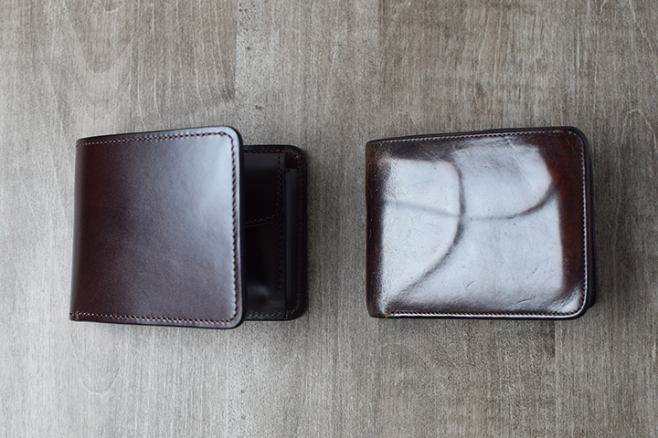 使用前のアイテム(画像左)と先ほどご紹介した18年使用のエイジングサンプル(画像右)と比べてみました。サドルプルアップの場合、使用前でもある程度艶がありますが、使用することで現れる艶は別格です。