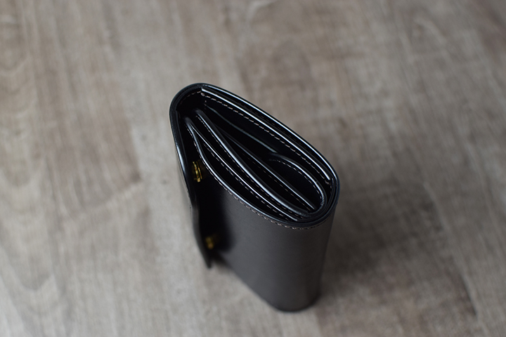 内装を開くと、左にカード段、右にコインケースを備えています。札室は本体のサイドに設けております。カード段は外周をL字でなぞるように縫製をかけたあおりポケットにより、カード段に収まり切らないカードが複数枚収納できます。