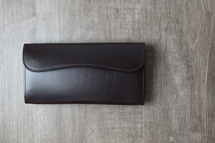 先ずは大型長財布・サドルプルアップWAVE(ウェイブ)/チョコです。使用は2年程ですが、艶が製品全体を覆っています。サドルプルアップはゆっくりとエイジングする皮革で、1~2年経過する頃からようやく明確な変化が現れます。