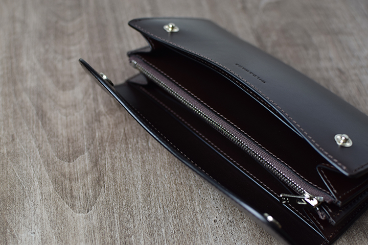 コインケースは内装の下部に設けています。本体とは別にコインケース自体に1点のホックを備えているので、仮に本体を傾けて開いた場合でもコインケース内のコインなどが落下するリスクがありません。札室は本体のサイドに設けていますが、一番大きな日本紙幣である一万円札でも余裕で収納が可能です。