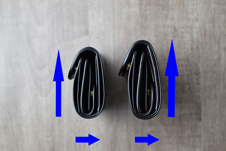 収納した紙幣が落ちないように札室を上向きにして本体を開くため、ホックを開く際はフラップを左側にして開きます。