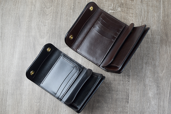 前胴を開くといよいよ内装が現れます。どちらもフラップを左側に置くと中央にカード収納部、右にコインケースが並びます。