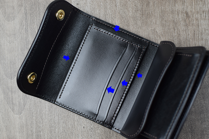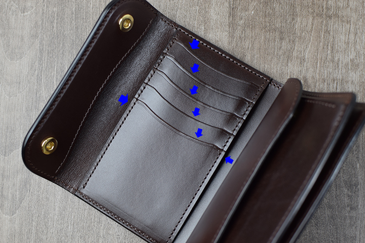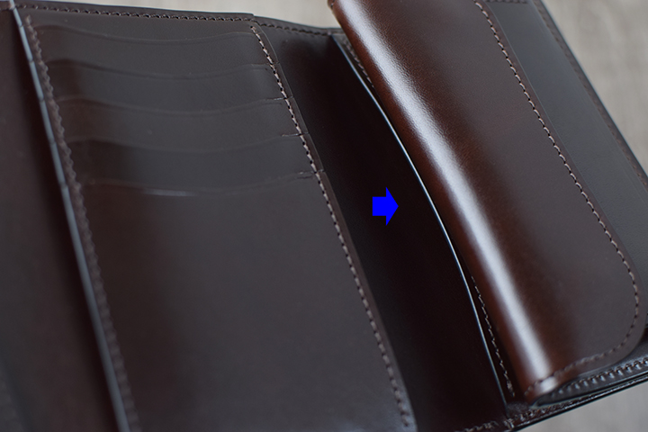 ENO、BYRNE共にコインケース内部には、「ベロパーツ」と呼ばれる革の仕切りを備えているので、内装中央のカード収納部に収まり切らなかったカードを「ベロパーツ」の奥に収納して頂けます。