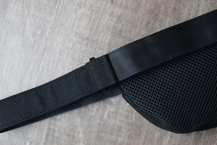 ショルダーストラップは一本のみとなりますが、最大幅が7㎝で十分なクッションが入っているため様々な動作に対応し、長時間身に着けても疲労を感じにくく工夫されています。