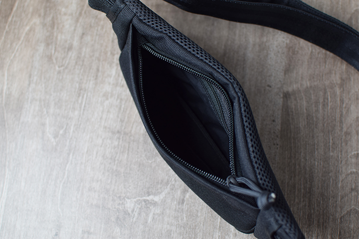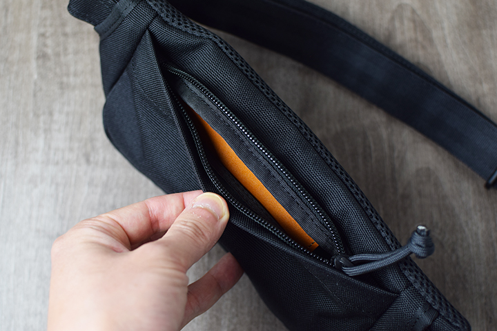 携帯性を重視しているバッグのため、メイン収納部の容量はそれほど大きいわけではありませんが、スマートフォンとミニ財布を同時に収納してもまだ少し余裕がありました。