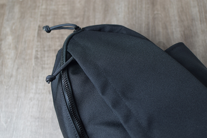 メイン収納部のファスナーはYKKのコイルファスナーを採用しています。程よい長さの引手が付くこちらのファスナーは驚くほど軽く、開閉もスムーズです。