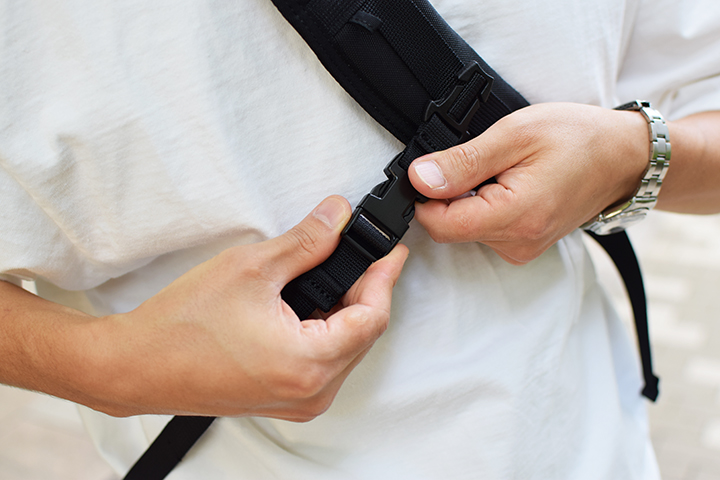 そして、こちらの細いストラップと太いストラップのバックルを接続させます。それぞれのストラップで長さの調整が可能ですので、様々なスタイルにフィットさせることが可能です。