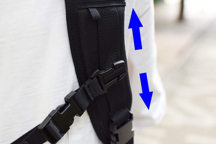 太いショルダーストラップに付属する細いストラップとの接続パーツは10㎝の範囲の中で上下に稼働します。装着方法などに合わせて細かなフィット感の調整が可能です。