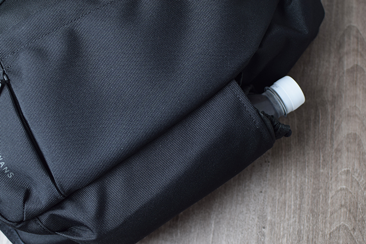先ずは本体サイドのポケットですが、こちらには500mlのペットボトルや折りたたみ傘の収納に適したスペースです。